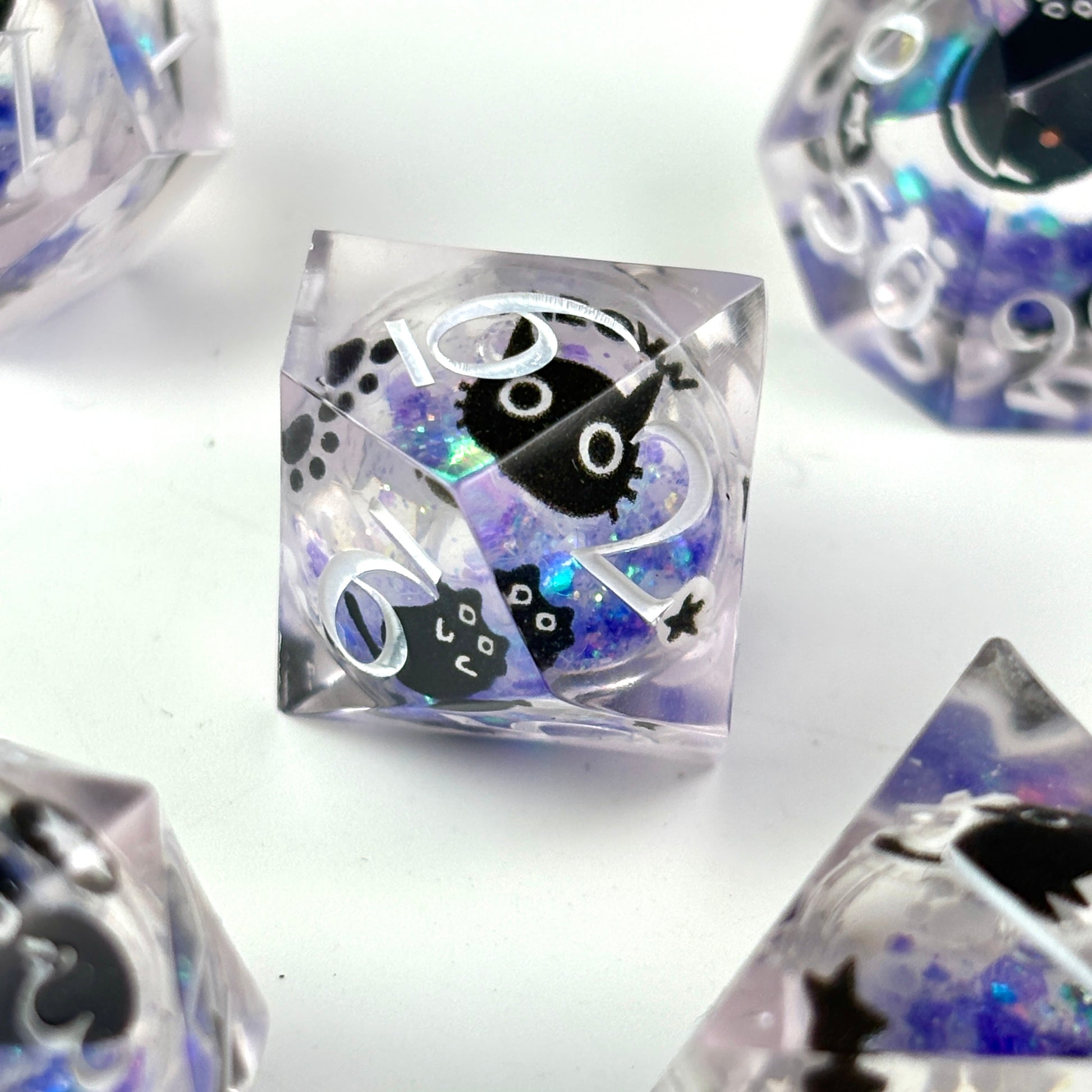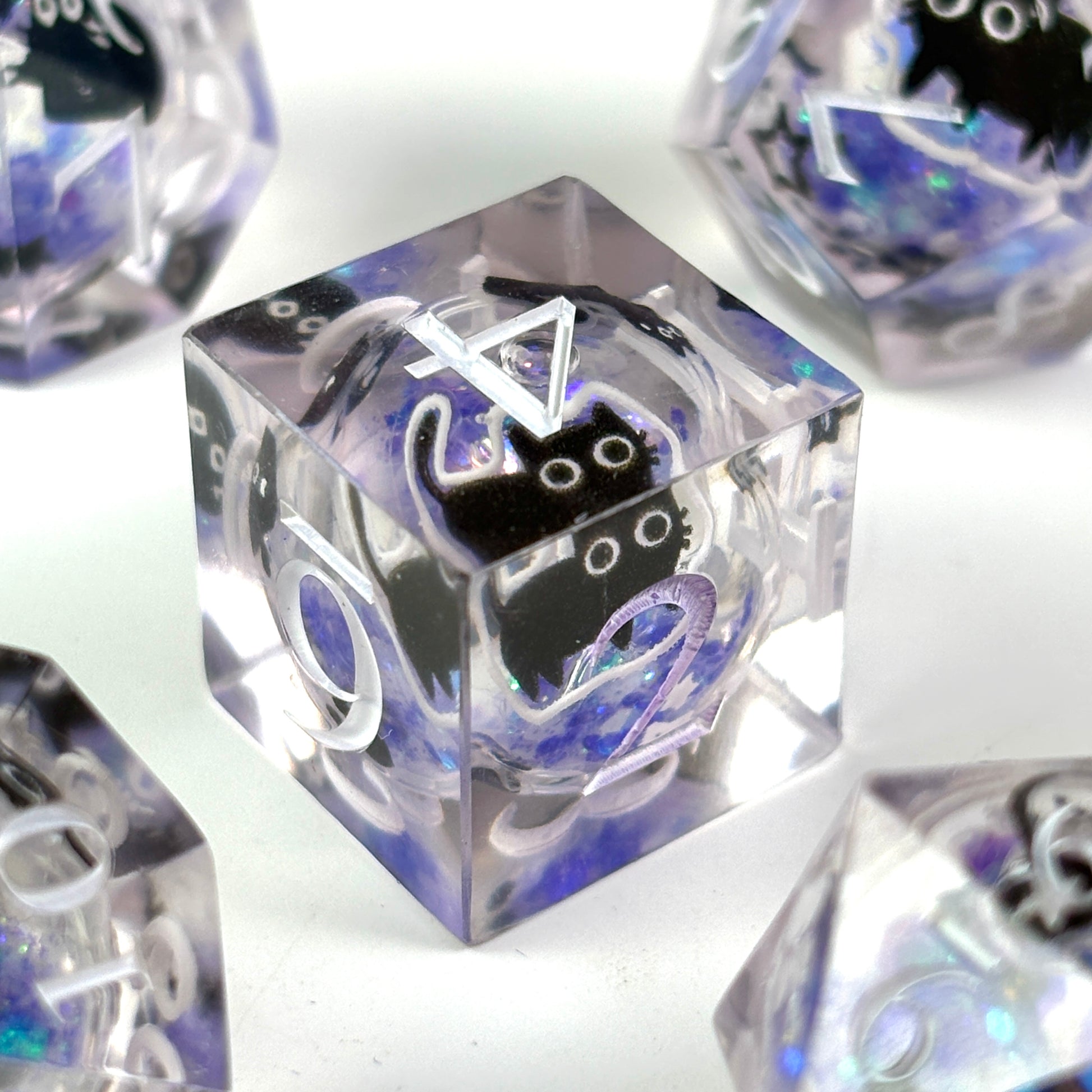 Inside each die, a shimmering liquid core swirls around adorable black cat sticker motifs, suspended in starlit violet resin. Hand-poured and sharp-edged, these dice offer both mystique and precision â ideal for witches, warlocks, or cat-loving collectors.
